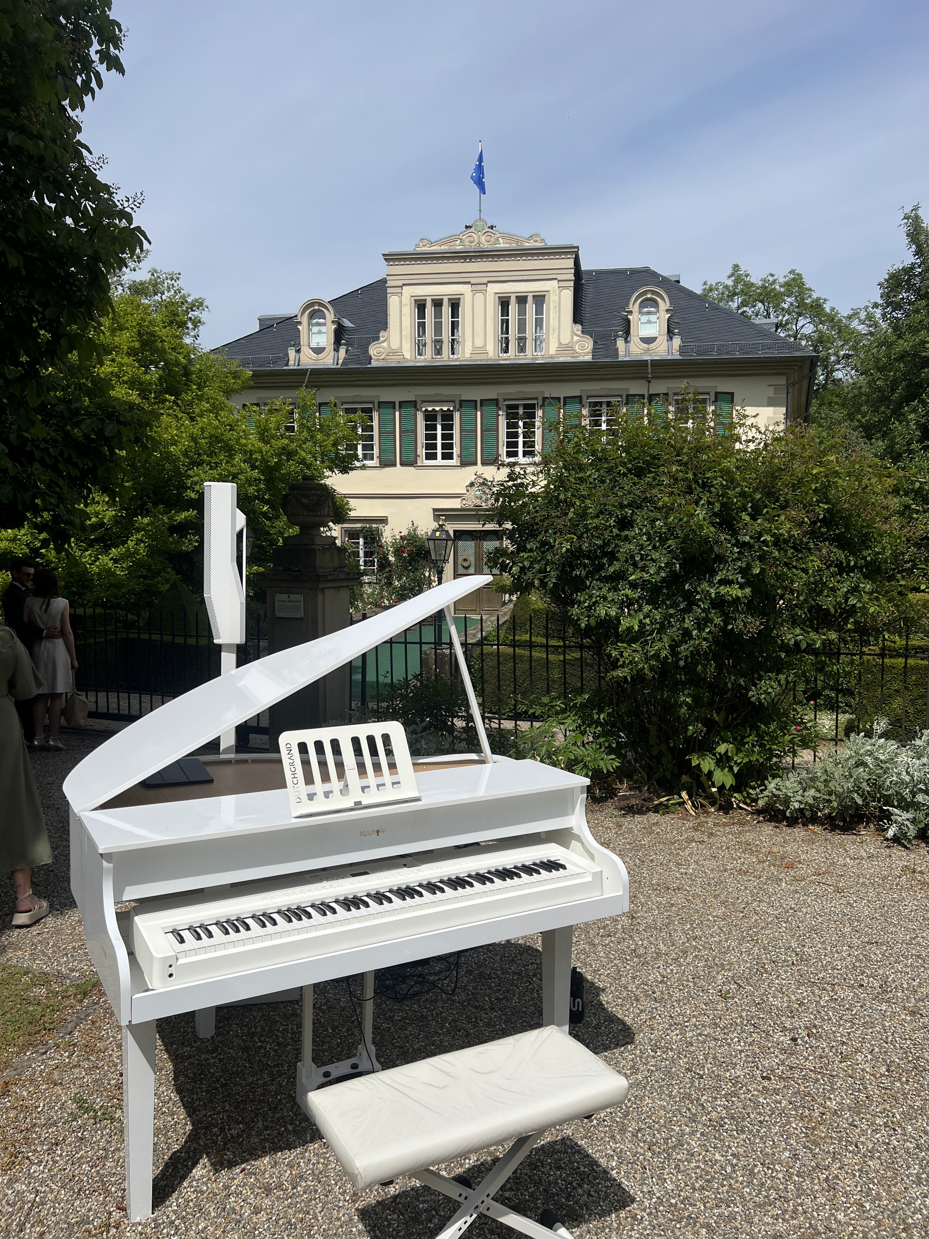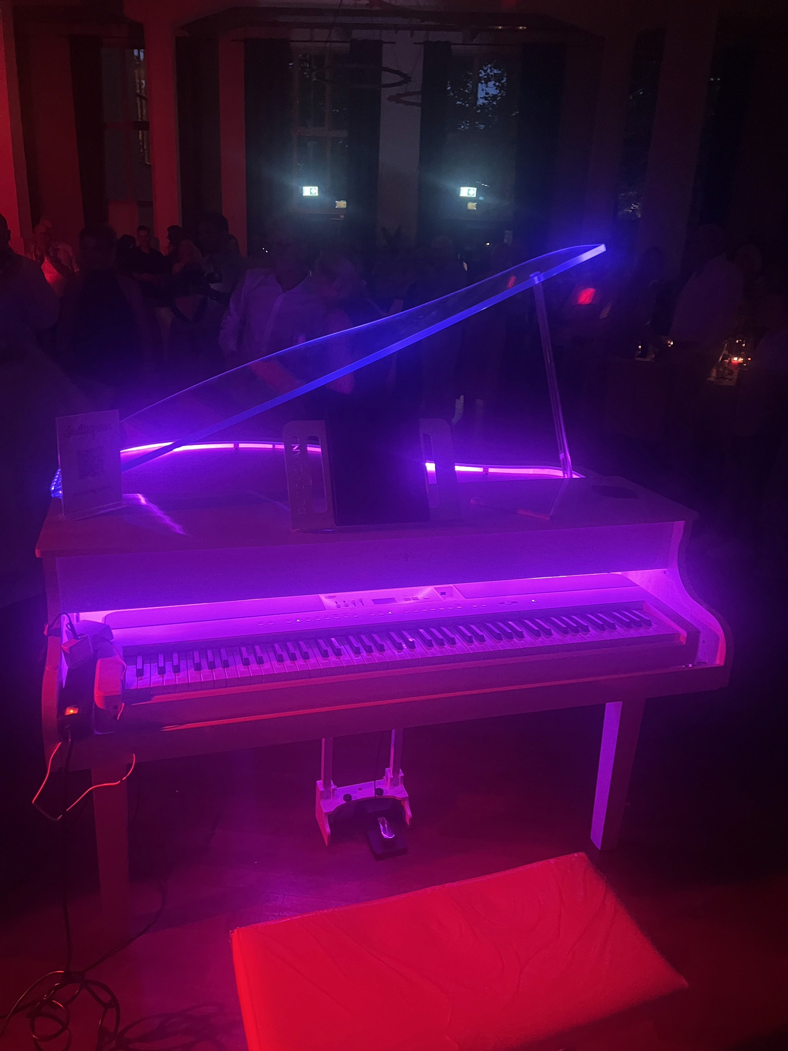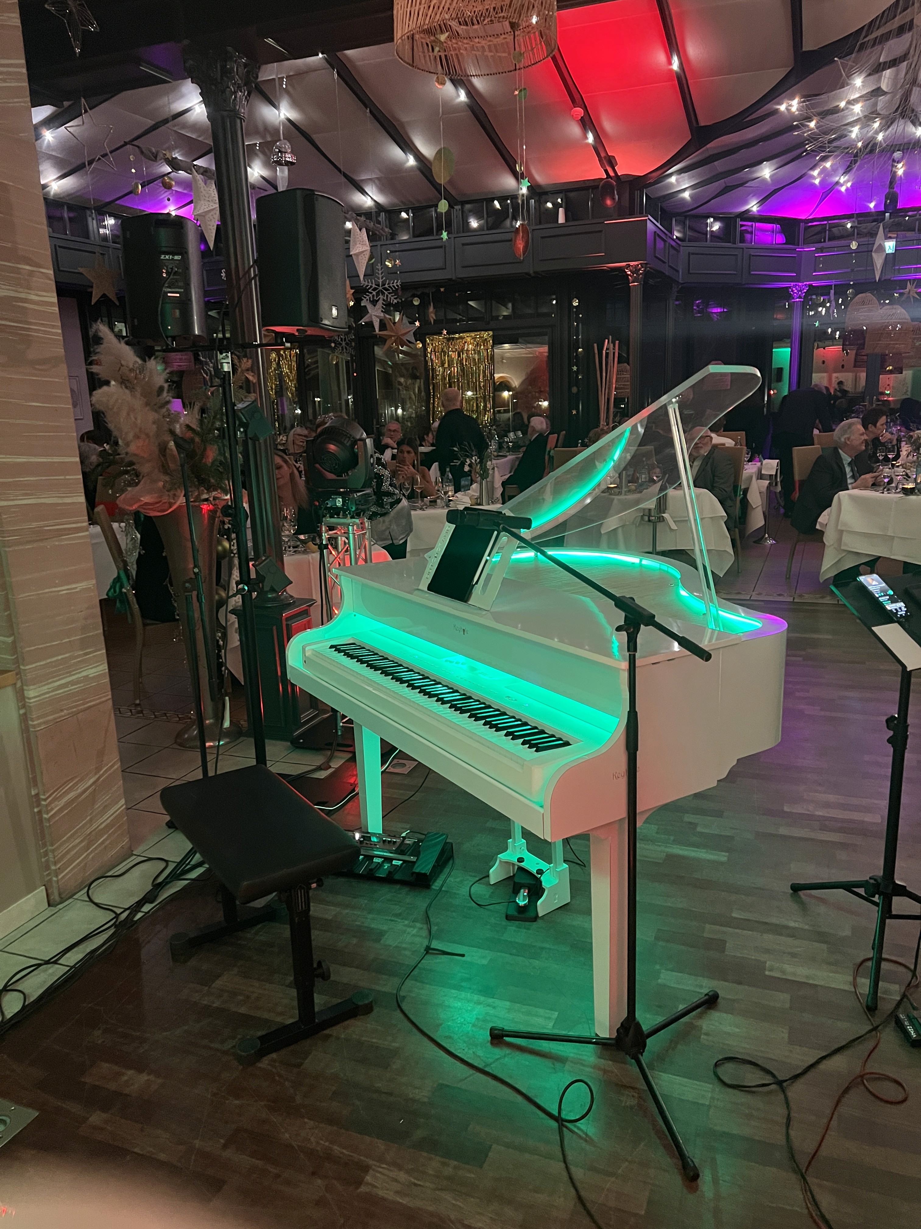 Mein einzigartiger, handgemachter Flügel aus den USA ist nicht nur ein echtes Unikat, sondern auch erstaunlich flexibel: Ich kann ihn überallhin mitnehmen und in nur 20 Minuten aufbauen. Je nach Wunsch lässt er sich entweder im modernen, transparenten Stil oder klassisch in Weiß präsentieren – so passt er sich perfekt an jedes Event- oder Raumkonzept an. Ideal für besondere Auftritte mit Stil und Charakter! Und das Beste: Es fallen keine Zusatzkosten an.